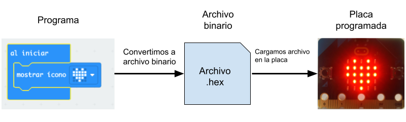 En nuestro caso escribimos las órdenes en nuestro entorno de programación, mediante bloques, al guardarlo lo convertimos a un archivo codificado en binario .hex (que contiene las instrucciones de programación en el lenguaje del microcontrolador) que cargamos en la placa.